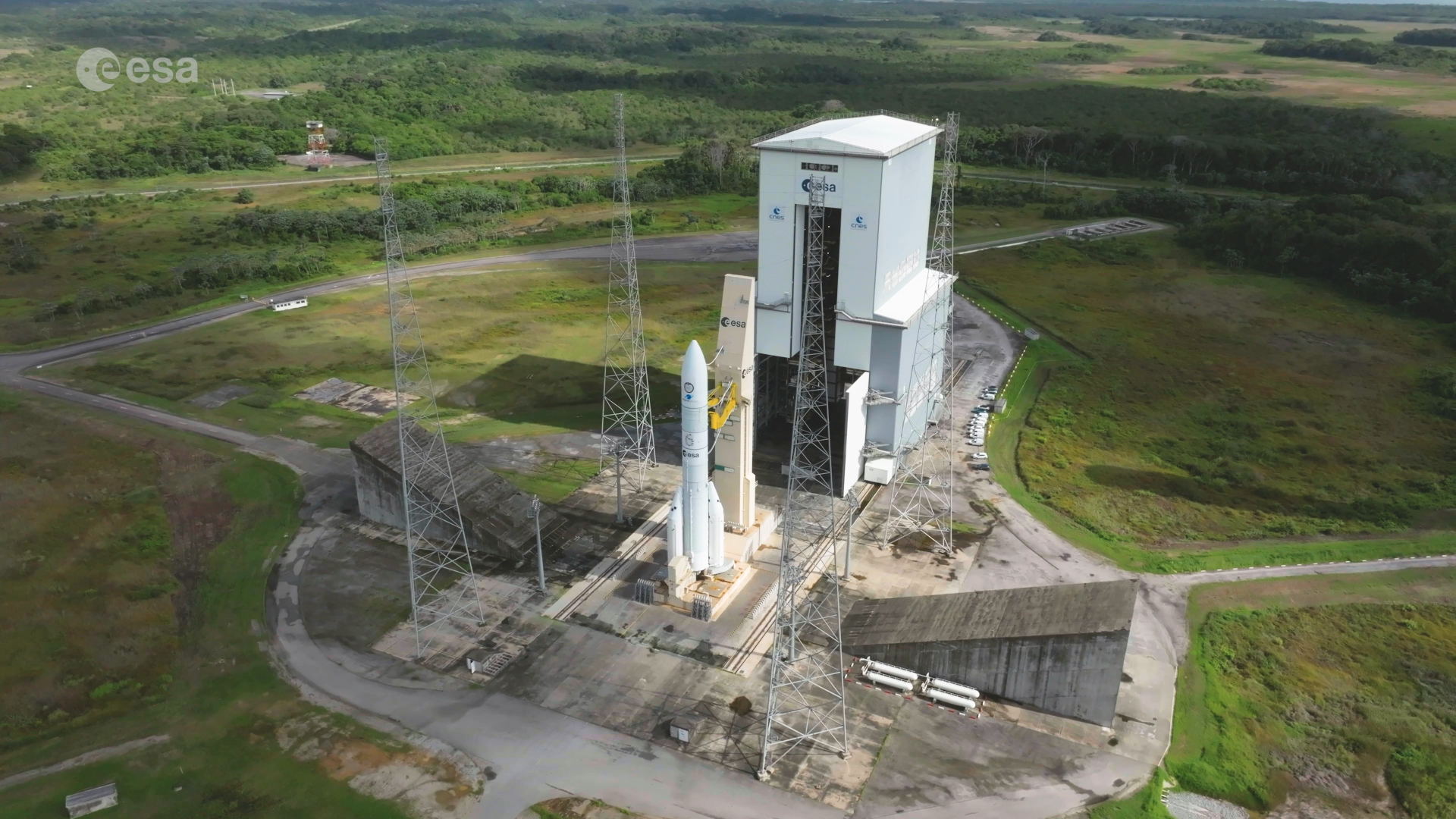 One of the first steps was to roll back the colossal 90-m tall Ariane 6 mobile gantry building 120 m away from the launch pad – the first moment the complete rocket stood free.